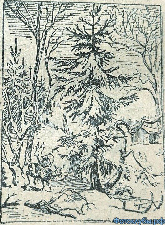 На картинке старый-старый рисунок: зима в лесу,ёлка,звери и лесоруб-браконьер,пришедший эту ёлку срубить