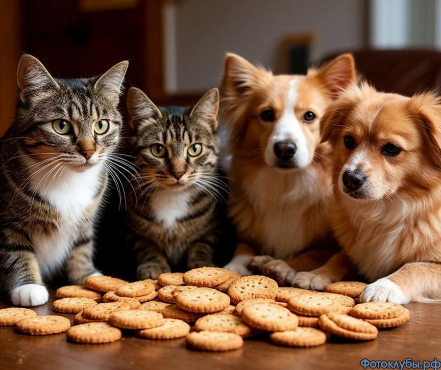 Каждой собаке досталось 6 галет, каждой кошке — пять.