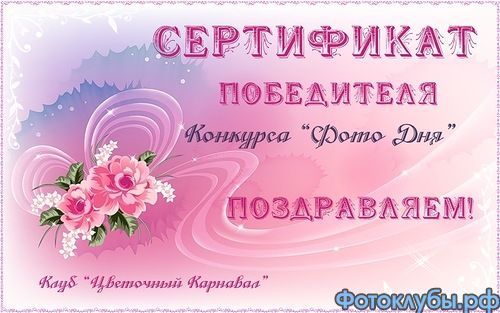ПОЗДРАВЛЯЕМ! Ваше фото "Подсолнух" стало победителем конкурса "Фото Дня" в клубе "Цветочный карнавал"! Вручаем Вам сертификат победителя: Фото помещено на главную страничку клуба и в "ЗАЛ СЛАВЫ"! Желаем новых творческих успехов! С уважением к Вам модераторы клуба "Цветочный карнавал"!